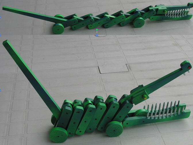 Beim Bau dieses Bewegungsmodells befasst sich der Schüler mit einem Scherenmechanismus, welcher mit einem Hebel (Schwanzteil) bedient wird. Das Krokodil kann eingefahren (Maul geöffnet) und ausgezogen werden (Maul geschlossen).